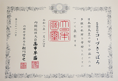 国立大学法人 北海道国立大学機構 小樽商科大学へ1,000万円を寄付したことが高く評価され、受章に至りました。