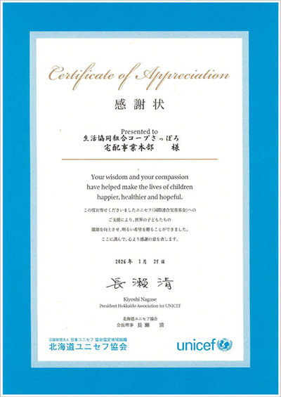 2026年1月29日『北海道ユニセフ協会 感謝状』
