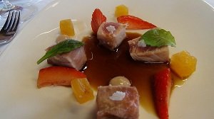 サーブの手が震えていたり、お食事が少しぬるくなってしまったり、ポストレ(デザート)のマカロンが落ちてしまったり、ハプニングもいろいろなりながら、目の前でパフォーマンスをしながらサーブしてくれるのが楽しかった。他では味わえない「体験」ができる場所。