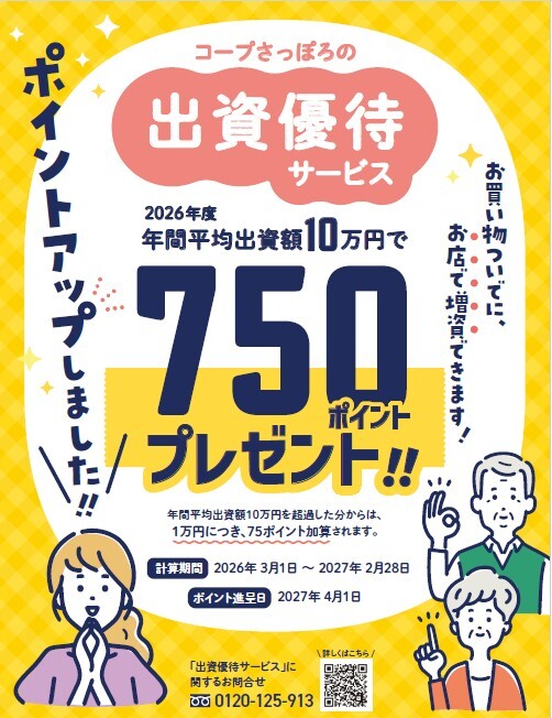 ご希望される組合員様には、毎年4月上旬に、出資優待進呈ポイントや出資金残高などを記載した「出資優待サービスのお知らせ」を郵送いたします。