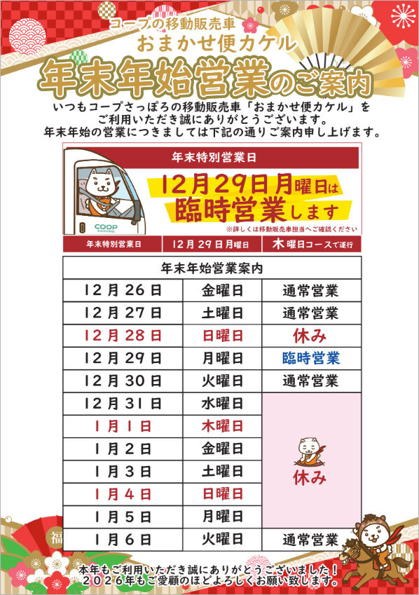 コープさっぽろ店舗 年末年始の休業日と営業時間