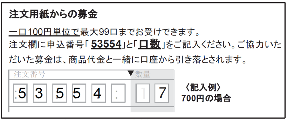 - ご協力いただいた募金は、商品代金の引き落とし時に口座から引き落としになります。