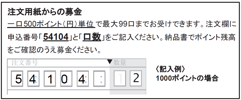 - 注文用紙の4桁以上の注文欄に、申込番号「54104」と「口数」をご記入ください。