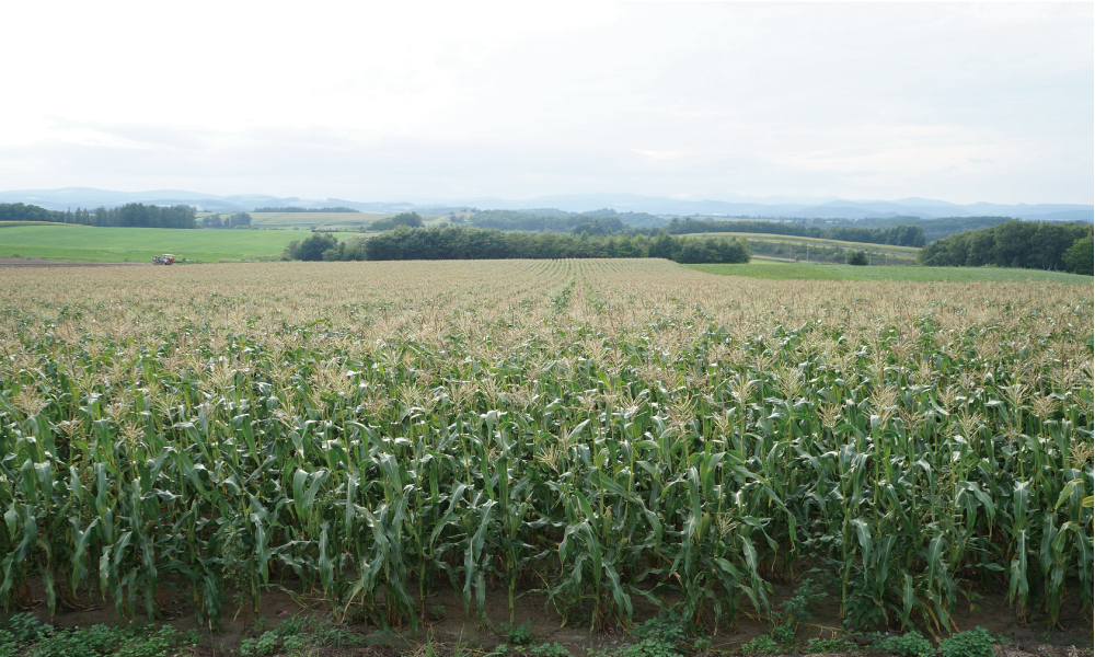 まずは訓子府町のコーン畑へ。「果て〜し〜ない〜♪」と思わず歌い出したくなる雄大な景色が広がっていました。