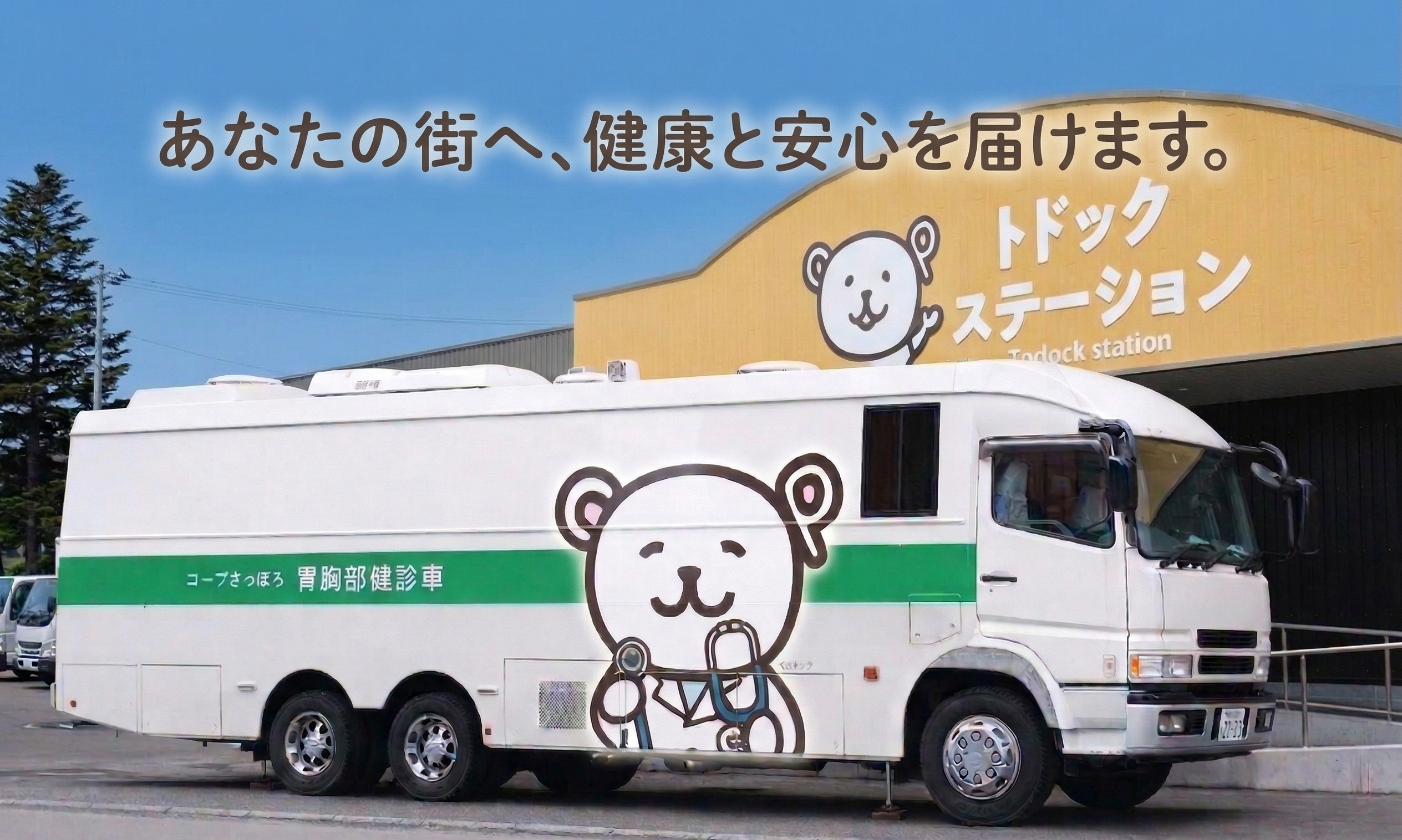 北海道では過疎化が進む地域が増え、組合員様から「地域のかかりつけ医療機関も長距離で通いづらい」「自宅近くの店舗までなら行けます。」の声をいただき、健康管理のお役に立ちたいとの強い思いから、ご自宅近くの店舗や集会場などに直接出向き健康診断を行う「巡回型健康診断」に特化した医療機関として、レントゲン撮影バスに乗り北海道全域をまわっております。