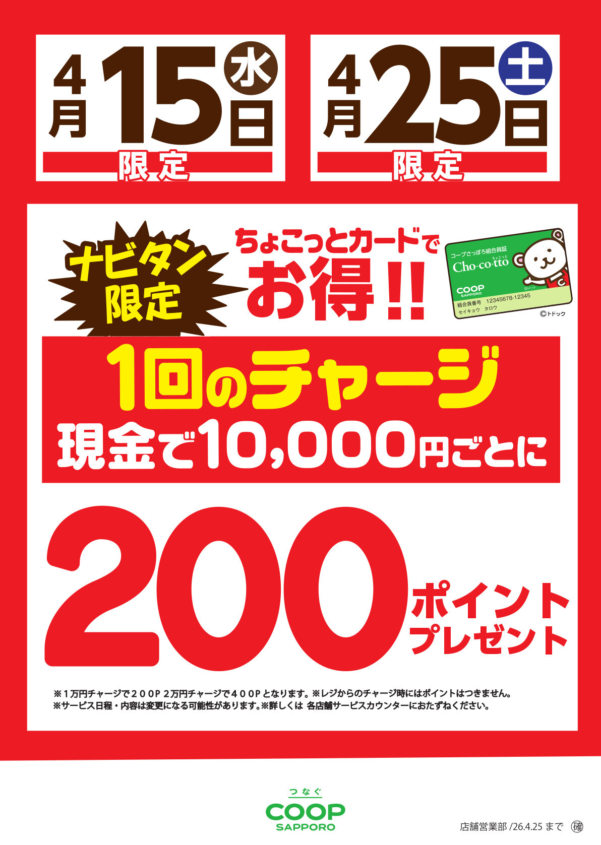 特別企画 4月15日、25日はちょこっとカード200Pチャージデーも実施!!