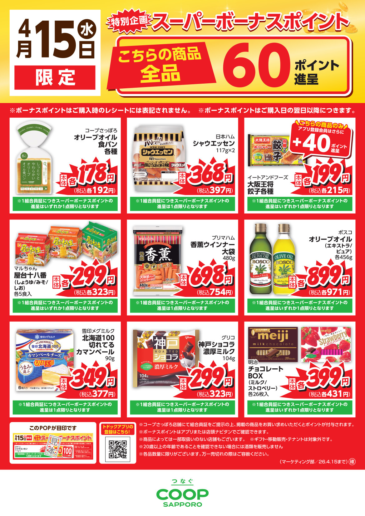15日に店舗にて対象商品をお買い上げいただくと、自動でポイント付与します。